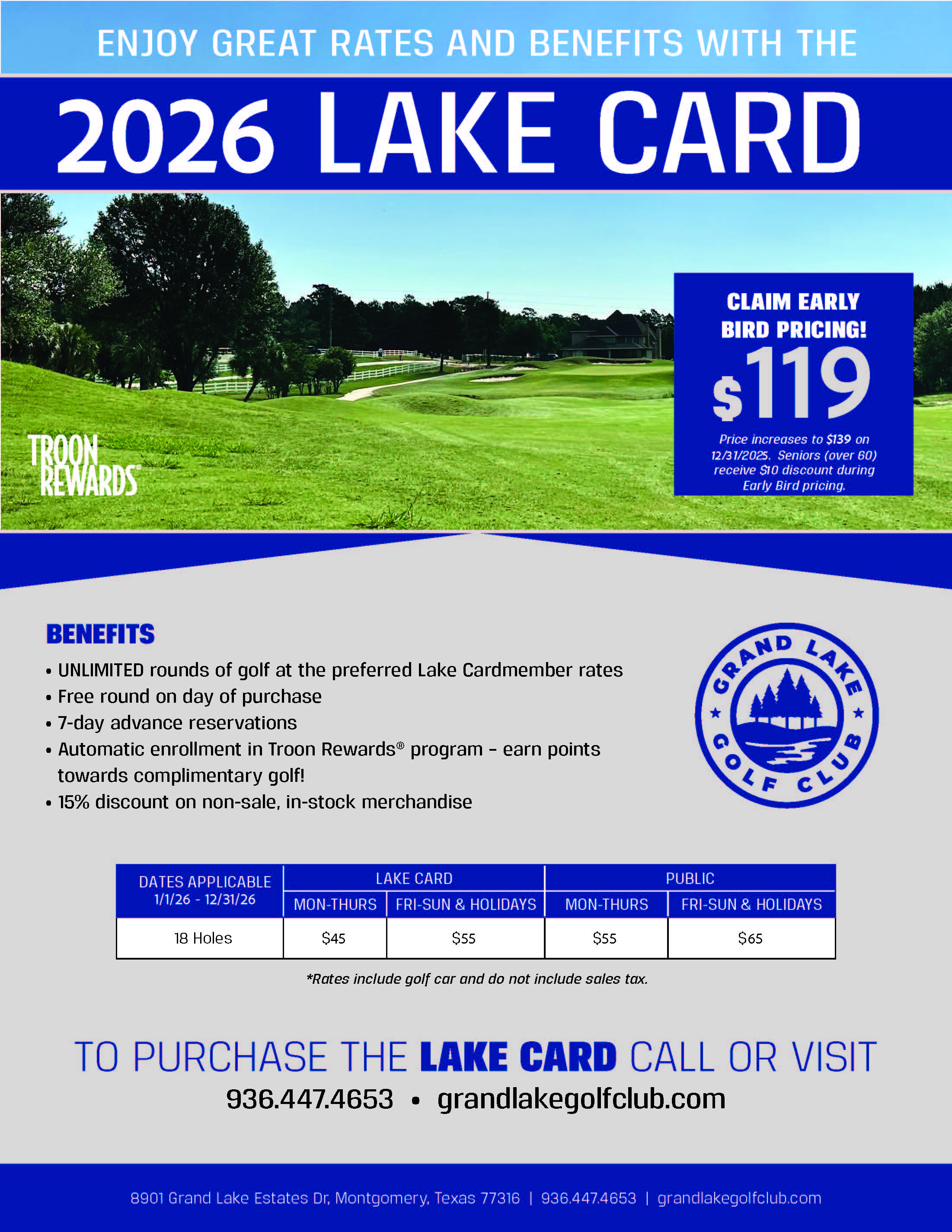 The 2026 Lake Card provides players with a discount on every round while earning points towards FREE Golf though Troon Access . Enjoy this great program all year and play discounted golf.